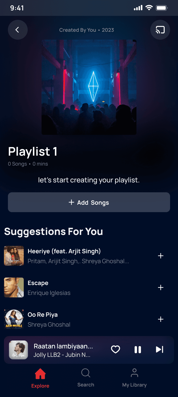 Users can easily build a full music library because after adding their first song, the app immediately shows them a list of highly relevant, recommended tracks right on the new playlist screen, leveraging their initial momentum to create a rich, sticky playlist.